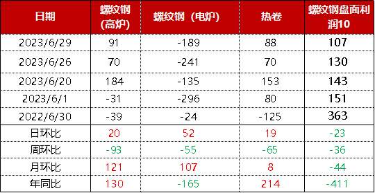 鋼材成本方面,6月份以來煤焦、鐵礦等原料價格觸底反彈,鋼材成本未進(jìn)一步下移。利潤方面,隨著鋼價小幅反彈,鋼廠生產(chǎn)利潤環(huán)比小幅改善。截至6月29日,找鋼網(wǎng)調(diào)研的高爐和電爐鋼廠螺紋鋼噸鋼生產(chǎn)利潤分別為91元/噸和-189元/噸,月環(huán)比分別上升121元/噸和107元/噸。