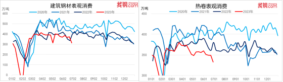 從鋼材表觀消費(fèi)來看,截至6月29日,找鋼網(wǎng)跟蹤調(diào)研的建筑鋼材表觀消費(fèi)量312.47萬噸,月環(huán)比下降56.78萬噸,環(huán)比降幅15.38%;熱軋板卷表觀消費(fèi)量332.54萬噸,月環(huán)比下降27.26萬噸,環(huán)比降幅7.58%。