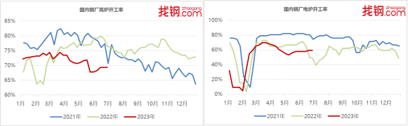 從鋼廠生產(chǎn)情況來看,6月份鋼材價格階段性反彈,高爐鋼廠盈利水平繼續(xù)小幅改善,鋼廠開工率小幅回升;而電爐鋼廠繼續(xù)虧損,但虧損幅度有所收窄,電爐鋼廠開工率未進(jìn)一步下降。截至6月29日,找鋼網(wǎng)跟蹤調(diào)研的國內(nèi)獨(dú)立電爐鋼廠開工率為59.09%,周環(huán)比持平,月環(huán)比上升1.49個百分點(diǎn);高爐方面,找鋼網(wǎng)跟蹤的國內(nèi)高爐鋼廠開工率為69.33%,周環(huán)比上升0.08個百分點(diǎn),月環(huán)比上升1.6個百分點(diǎn)。